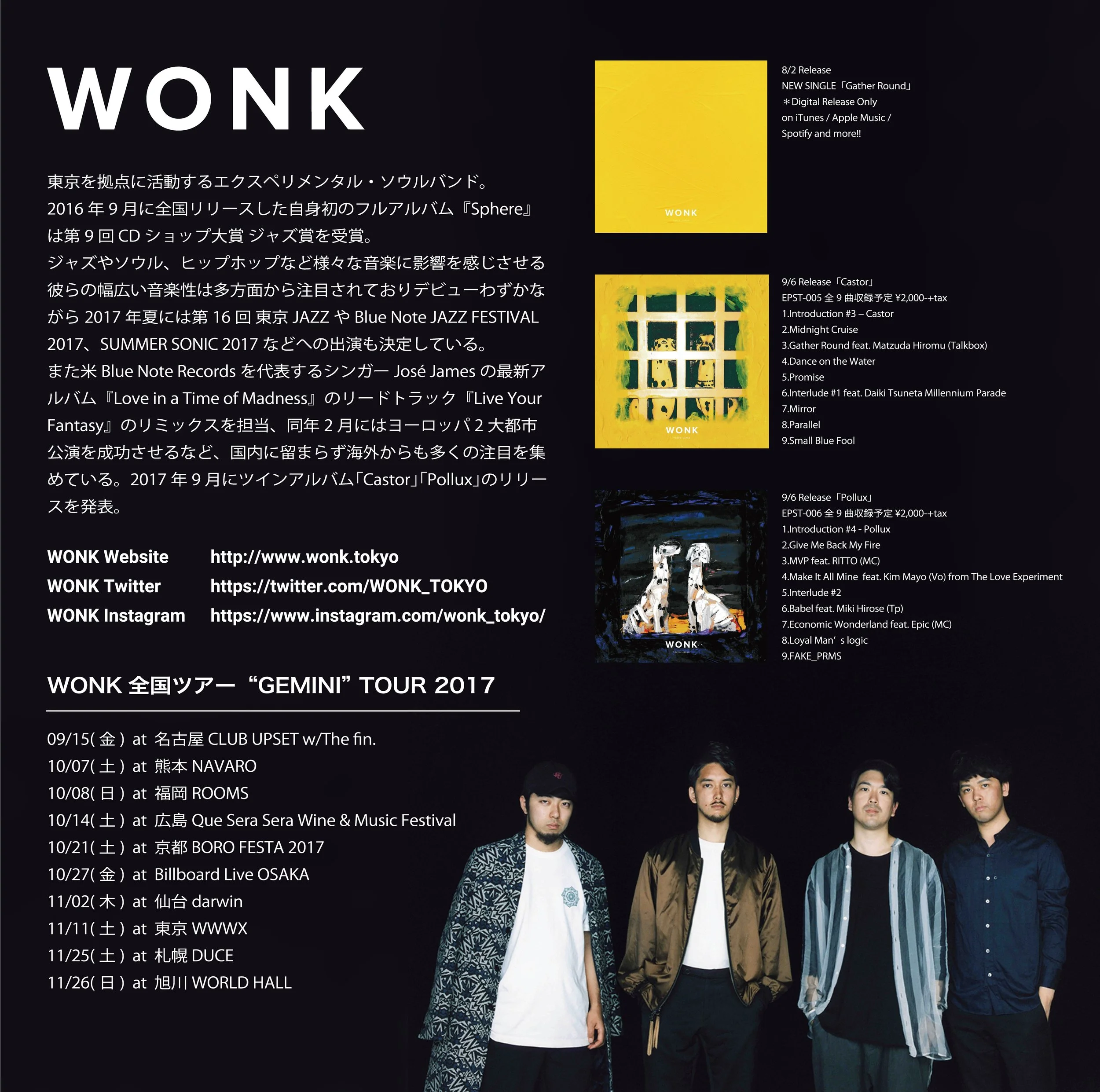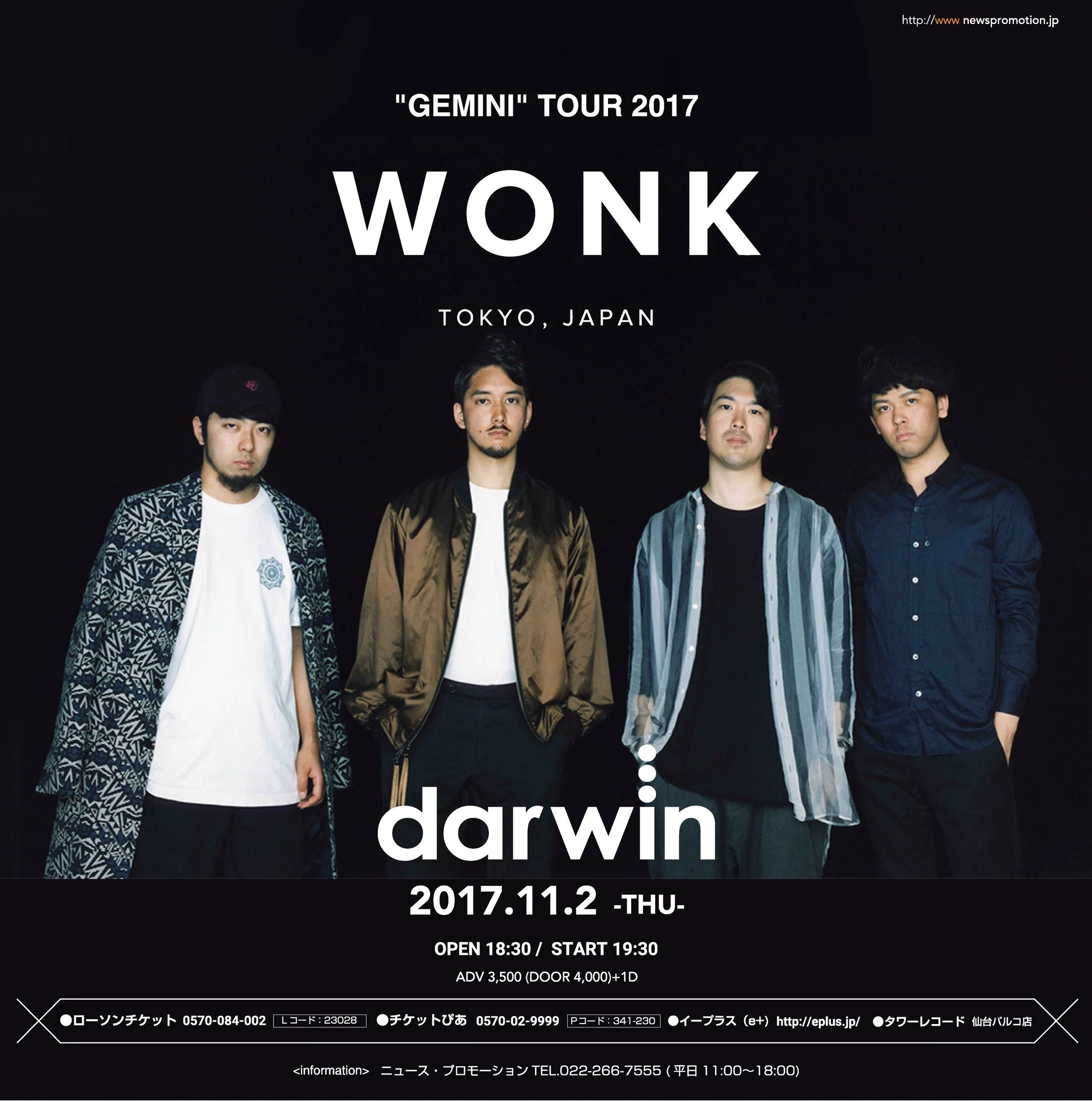 -WONK "GEMINI" TOUR 2017- live in SENDAI Thursday, November 2, 2017 6:30 PM 11:00 PM 18:30 23:00 Google Calendar ICS @Darwin SENDAIOPEN : 18:30START : 19:30TICKET : adv¥3500 / door¥4,000TICKET info ↓ちけっとぴあ 0570-02-9999 Pコード:341-230ローソンチケット 0570-084-002 Lコード:23028 TICKET